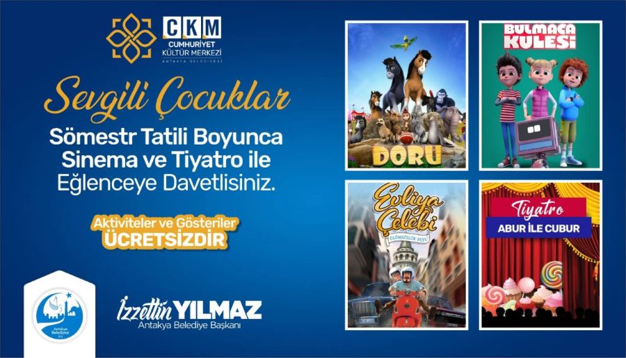 Antakya Belediye Başkanı İzzettin Yılmaz, yarıyıl döneminde öğrencilere küçük bir hediye vermek istediklerini söyleyerek: “Amacımız Cumhuriyet Kültür Merkezi’miz ile tiyatro ve sinemayı sevdirmek ve öğrencilerimizin tatillerini güzelleştirmek. Karnesini getiren tüm öğrencilerimize Cumhuriyet Kültür Merkezi’mizde gösterimi yapılacak olan sinema ve tiyatro biletlerinden hediye ediyoruz. Yoğun bir ilgi ile karşı karşıyayız. Sevdiği çizgi filmleri sinema keyfiyle izlemek isteyen tüm öğrencilerimizi bekliyoruz. Biletlerimiz bugün dağıtılmaya başladı geç kalmayın. Tüm öğrencilerimize iyi tatiller diliyorum.” dedi.