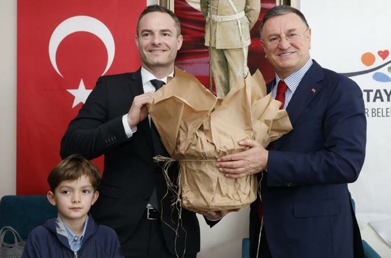 Başkan Savaş, ziyaretin sonunda Frederick Brütting’e Hatay’a özgü çeşitli hediyeler verdi.