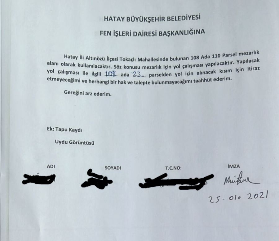 Yaptığımız çağrı sonucunda Hatay Büyükşehir Belediye Başkanı Doç. Dr. Lütfü Savaş Tokaçlı Mahallesi'nden bir vatandaştan alınan muvafakatname sonrasında bir çalışma başlattı. Fen İşleri Dairesi tarafından başlanan çalışmalarda yol açıldı. Alanda duvar örme çalışmaları da başladı. Ancak 1 aydan bu yana alanda hiçbir çalışma yapılmadı. Çalışmaların durmasının ardından kendini bilmezler tarafından alana zeytin fidanları dikildi ve bir konteyner yerleştirildi.