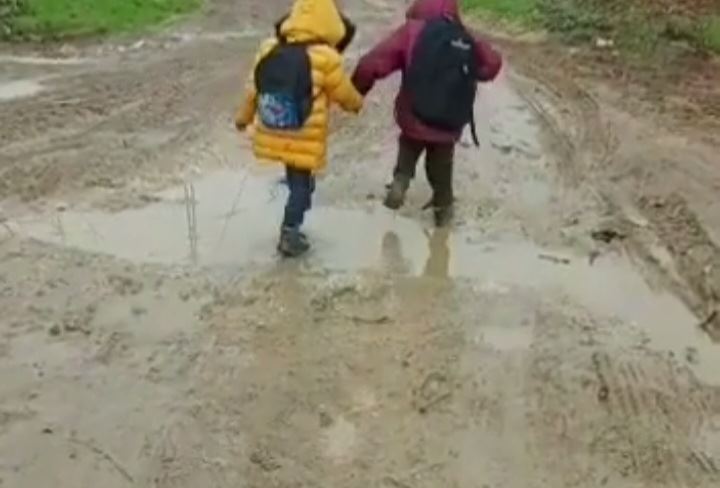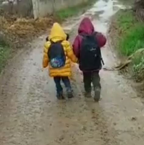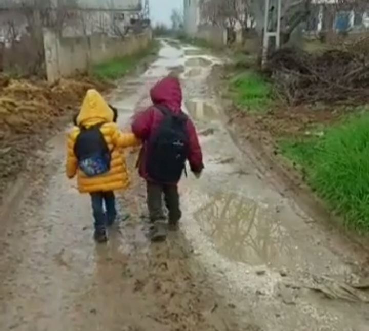 Hatay'ın Altınözü ilçesinin Keskincik Mahallesi’nde öğrenciler çamur deryalarını aşarak okula gidiyor.