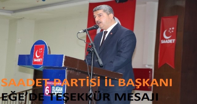 İl Başkanı Eğe mesajında; Saygıdeğer Muhterem hemşehrilerim, ?Hakkın, adaletin, iyinin doğrunun mücadelesinin temsilcisi Saadet Partimizin 6. Olağan İl Kongresi?ni büyük bir gurur, çoşku ve heyecanla gerçekleştirdik. Davetimizi kırmayarak kongremize teşrif eden değerli misafirlerimiz, siyasi parti temsilcilerimiz, sivil toplum kuruluşları temsilcilerimiz, teşkilatımızın başka gençlik kolları olmak üzere fedakar mensupları, basın mensupları, değerli hemşehrilerimiz, güvenlik tedbir ve kamu alanında görev yapan güvenlik kuvvetlerimiz ve ismini zikredemediğim iştirak eden tüm gönül dostlarımıza ayrı ayrı teşekkür ederim.