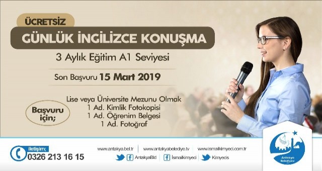 Antakya Belediyesi Kültür ve Sosyal İşler Müdürlüğü bünyesinde verilecek olan ücretsiz İngilizce kursuna katılmak isteyen vatandaşların Kültür ve Sosyal İşler Müdürlüğü?ne başvurabilecekleri veya 0326 213 16 15 numaralı telefondan bilgi alınabileceği belirtildi. (Haber Merkezi)