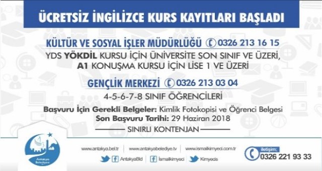 Üniversite mezunlarına ve mezun konumunda olan öğrencilere Antakya Belediyesi ücretsiz YDS (Yabancı Dil Sınavı) YÖKDİL, Lise 1 ve üzeri sınıflar için A1 konuşma ve 4, 5, 6, 7 ve 8. Sınıf öğrencileri için A1 konuşma İngilizce kurslarının başvurularının başladığını müjdeledi.