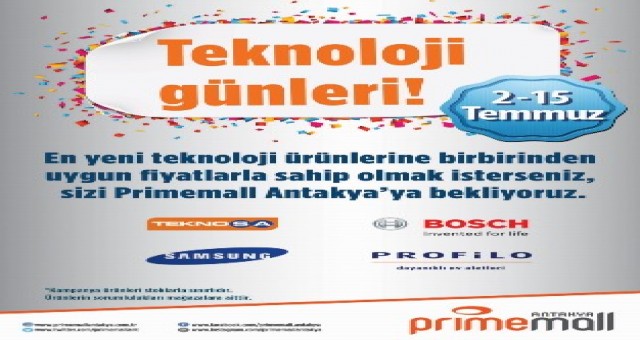 Antakya?nın en çok ziyaret edilen alışveriş merkezi Primemall Antakya?da teknoloji rüzgarı esiyor. 15 Temmuz?a kadar devam edecek olan ?Teknoloji Günleri?nde, Primemall Antakya?nın ziyaretçileri son teknoloji ürünlerine sürpriz fiyatlara sahip olma şansı yakalayacak.