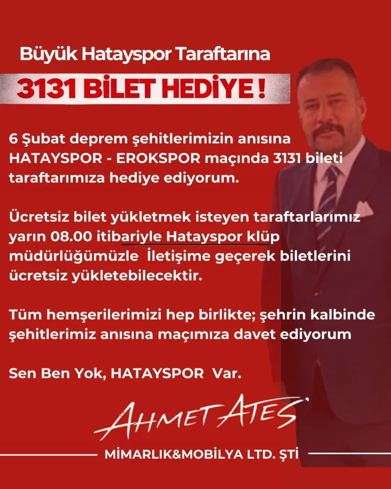 Hatayspor taraftarına anlamlı bir destek geldi. İş insanı Ahmet Ateş (Mimarlık & Mobilya Ltd. Şti.), 6 Şubat depremlerinde hayatını kaybeden deprem şehitlerinin aziz hatırasına, Hatayspor – Erokspor karşılaşmasında geçerli olmak üzere 3131 bileti taraftarlara ücretsiz olarak hediye etti.