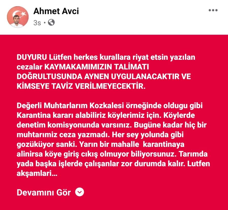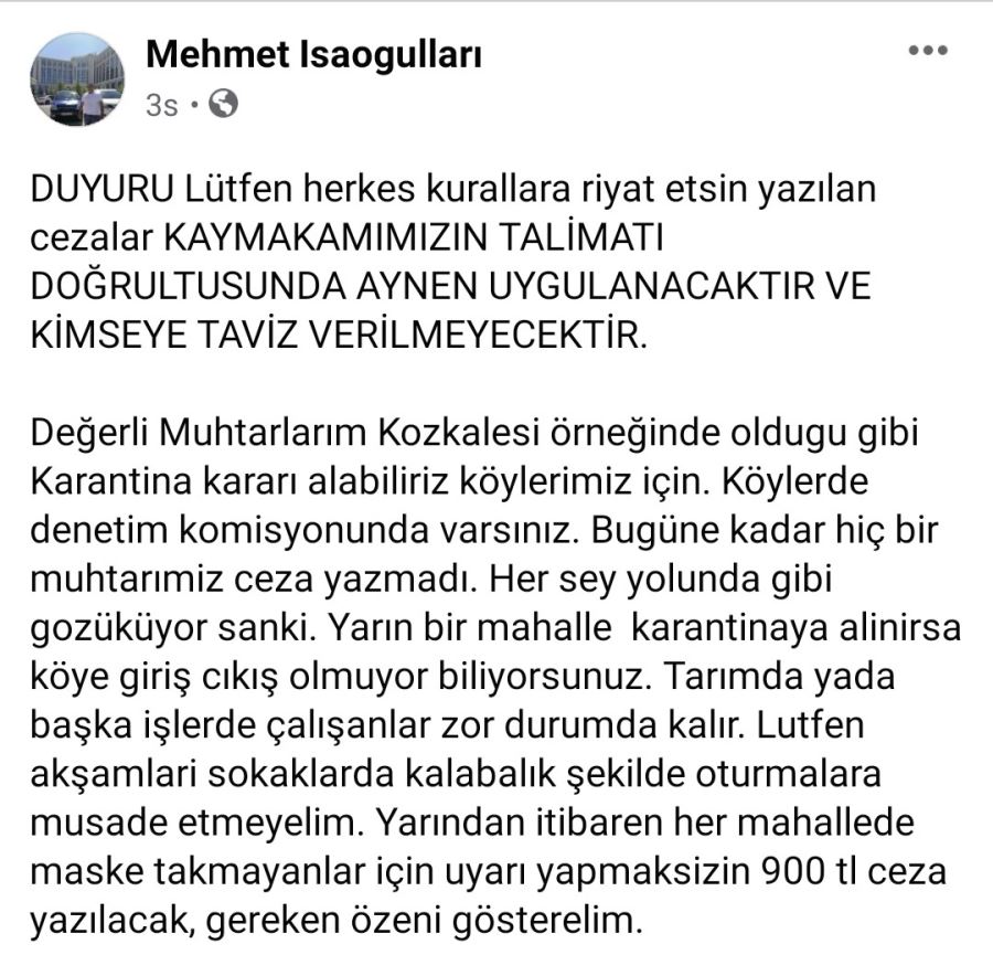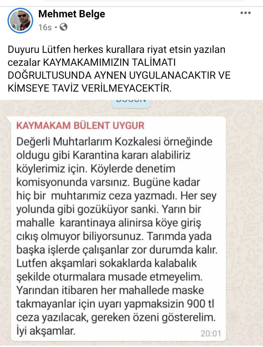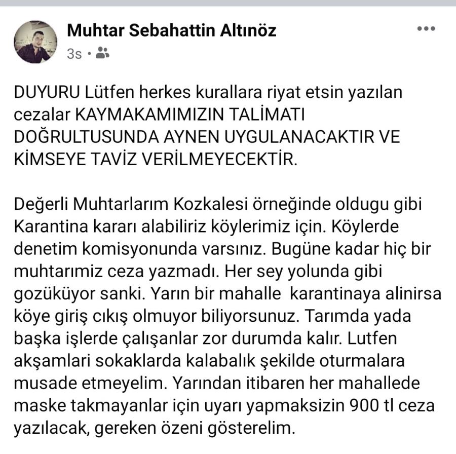 İlçe Kaymakamı Bülent Uygur alınan kurarlara uyulması için köy muhtarlarına mesaj gönderdi. İlçe Kaymakamı Bülent Uygur'un tarafından gönderilen mesaj bu şekilde: “Değerli Muhtarlarım Kozkalesi örneğinde olduğu gibi karantina kararı alabiliriz, köylerimiz için köylerde denetim komisyonunda varsınız. Bugüne kadar hiç bir muhtarımız ceza yazmadı. Her şey yolunda gibi gözüküyor sanki. Yarın bir mahalle karantinaya alınırsa köye giriş çıkış olmuyor biliyorsunuz. Tarımda ya da başka işlerde çalışanlar zor durumda kalır. Lütfen akşamları sokaklarda kalabalık şekilde oturmalara müsaade etmeyelim. Yarından itibaren her mahallede maske takmayanlar için uyarı yapmaksızın 900 tl ceza yazılacak, gereken özeni gösterelim." Gazetemiz manşetleri ve haberleri ile sürekli Corona virüs tedbirlerini gündeme getirdi. Tedbirlere kim uymazsa, isterse bu kaymakam olsa dahi uyardı. Çünkü bu ciddi bir olaydır. İhmale gelmez. Kaymakamın da geçte olsa meseleye hassasiyet ile yaklaşmasını olumlu görüyor ve takdir ediyoruz. Sağlığımızı koruyalım, tedbirlere uyalım. Aynı hassasiyeti Altınözü ilçesindeki siyasilerinden de bekliyoruz. ( Haber: Mahmut ŞAN )